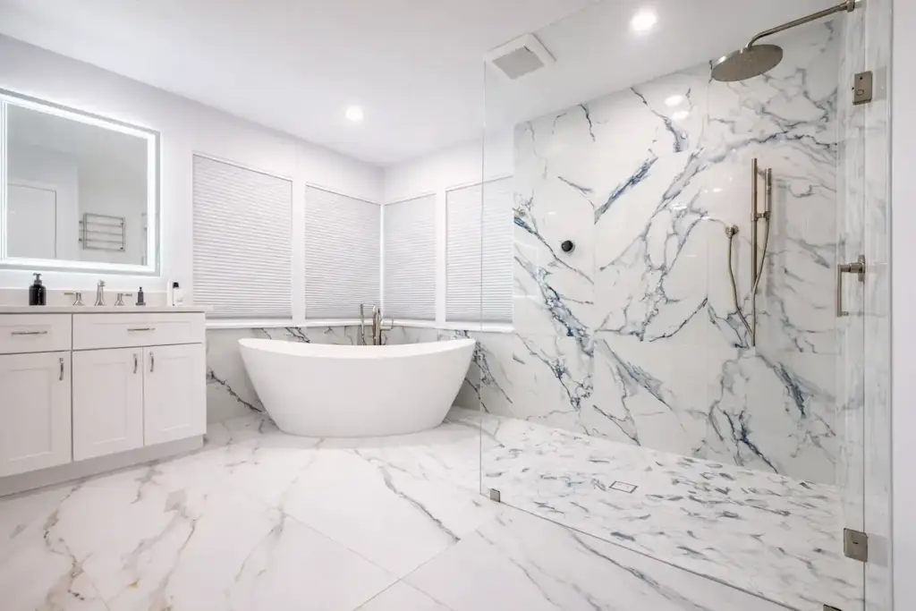 In larger bathrooms, homeowners may have room for both a separate shower and a tub. That can create a more high end primary bathroom layout, especially when the design includes custom tile, statement lighting, and quality materials.